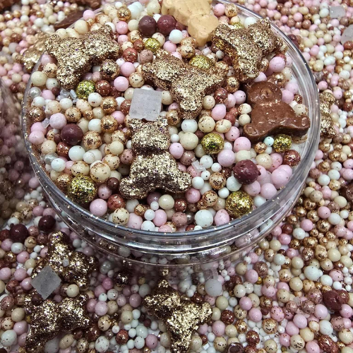 Make your desserts bear-y adorable with Cosmic Colors' Teddy Bear Girl Theme Sprinkle Mix! This blend features a playful mix of soft pinks, whites, golds, and cute teddy bear accents — perfect for baby showers, birthdays, or any girly celebration.