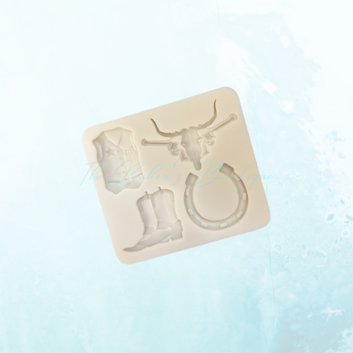 Bring rustic western vibes to your treats with our Western Themed Quad Mold. This versatile mold features classic cowboy-themed designs including a vest, longhorn skull, horseshoe, and cowboy boots. Perfect for fondant, chocolate, candy melts, or even clay projects, this mold makes it easy to create detailed edible toppers for cakes, cupcakes, cookies, and more.